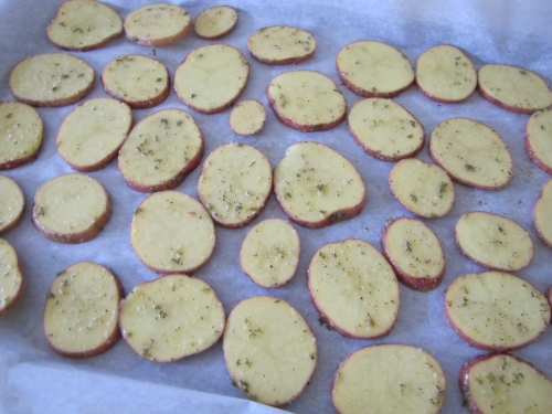 Baked Parmesan Sliced Potatoes…Easy and Delicious! 6 or more potatoes (I used red Potatoes) sliced about 1/4 inch thick Extra virgin olive oil as needed Garlic powder to taste Onion powder to taste Parsley flakes Sea salt to taste (optional) Ground black pepper to taste Grated Parmesan Reggiano (enough to sprinkle over the tops of the potatoes) Preheat the oven to 400 degrees. Cover the cookie sheets with parchment paper for an easy clean up.