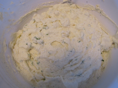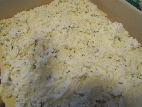 In a mixing bowl, blend together the ricotta, parsley, Parmesan Reggiano, mozzarella, egg, and ground pepper. I do not add onion or garlic to this because I usually have sliced onions, chopped garlic, and sliced mushrooms in my sauce, which will be layered into the lasagne.
