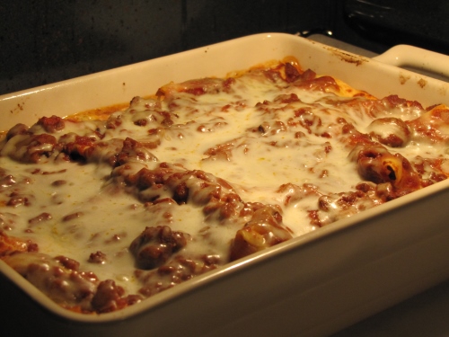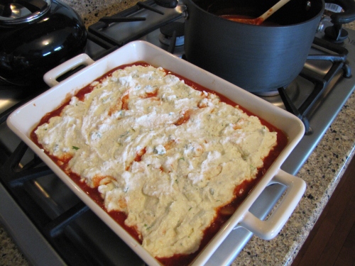 The layers are simple. Coat an 8” x 11” baking dish with olive oil. This size baking dish works especially well with the no boil lasagne noodles. Three across, slightly overlapped, fit the dish well. Either way, once the dish is prepared, start layering by putting sauce across the bottom of the dish. Then put a layer of the pasta, followed by a third of the ricotta and mozarella mixture. Next put about sauce on top of the ricotta mixture and spread across. Continue to do this for additional layers until about 1/4 to 1/2 inch or more from the top edge of your dish, finishing with pasta across the top. Cover the top noodles with sauce followed by the remaining 3/4 cup of shredded mozarella.