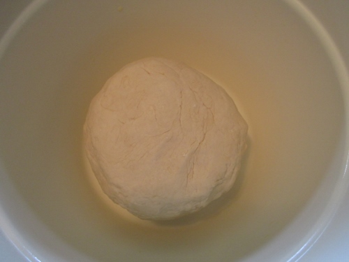Once done, place your ball of dough into a bowl, smoothing a touch of olive oil over the dough and over the sides of the bowl. Cover the bowl loosely with plastic wrap and then with a clean towel over that for about 30 to 40 minutes or longer and let it rest. It should double in size.