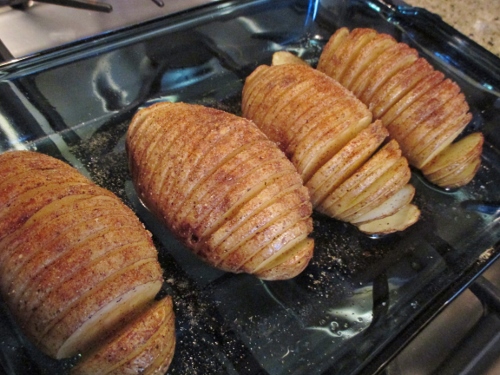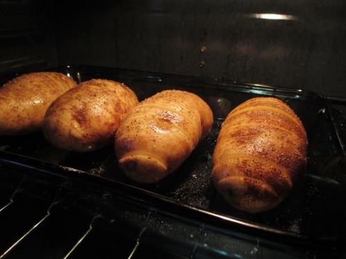 Preheat the oven to 425 degrees. Wash and scrub the potato skins well with a vegetable brush. Dry the potatoes and slice them across the width 1/8″ to 1/4″, but do not cut through the potato. Stop your slice before cutting all the way through creating a sliced potato with the bottom still in one piece. Place the potatoes in a baking dish that has been sprayed lightly with olive oil. With a food brush, brush about half the olive oil over the top of the four potatoes. Lightly sprinkle the potatoes with sea salt and black pepper to taste. Bake at 425 degrees for 30 minutes.