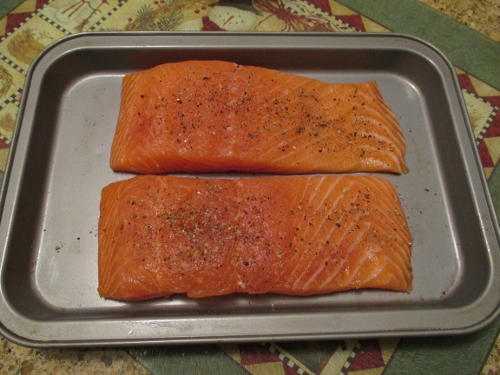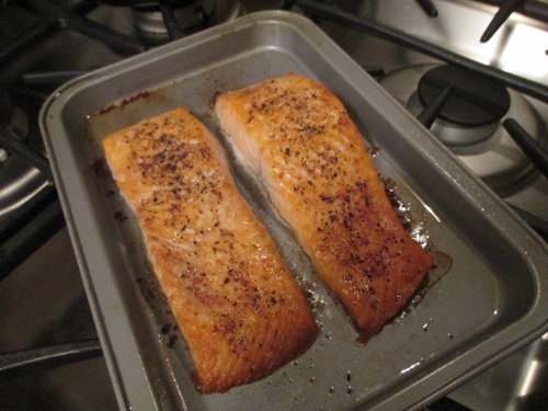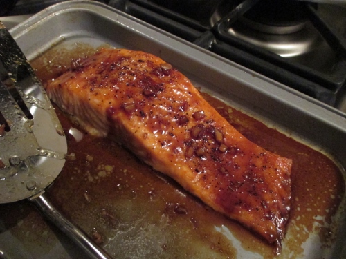 Then season to taste the salmon pieces with the sea salt and black pepper. Don’t over do the sea salt. Place the pieces on a pan to broil or grill. If broiling, broil the salmon three to four inches below the heating coil for 6 to 9 minutes depending on thickness, and until there is a slight crispiness on the top, but make sure the salmon is not overdone. If more than 3/4 inch thick, it may take longer. Watch carefully, and just before the last minute you can brush some of your sweet bourbon glaze lightly on the top of the salmon.