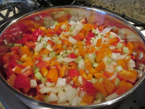 Sauté the onions, celery, bell peppers, and garlic in the olive oil until tender. When ready, add the diced tomatoes with juice (not drained), crushed tomatoes, sea salt, ground black pepper, and cayenne to this. Cover and simmer for about one hour.